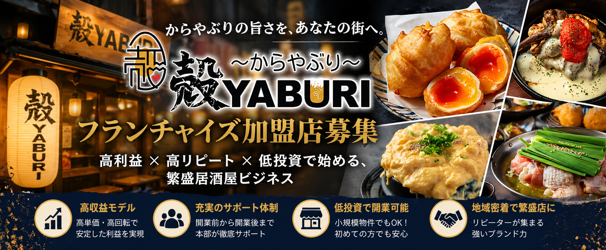 からやぶり FC加盟は、実績あるブランドと運営モデルを活用し、再現性の高い飲食店経営を実現するための加盟プランです。ゼロから店舗づくりを行うのではなく、すでに成果につながっている仕組みをもとに、開業から運営までをスムーズに進められる体制を整えます。