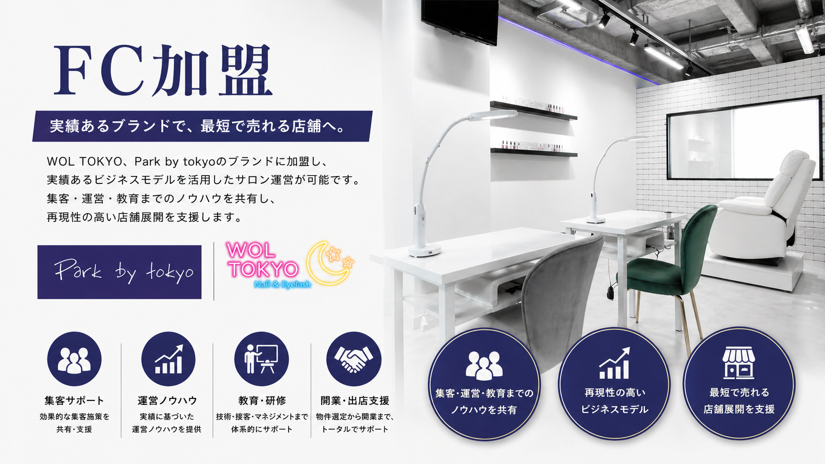 WOL TOKYO、Park by tokyoのブランドに加盟し、実績あるビジネスモデルを活用したサロン運営が可能です。